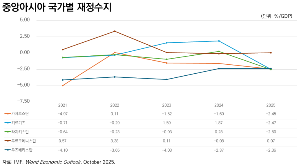 2025년에 중앙아시아 5개국의 재정수지는 모두 적자를 기록했다. 대규모 인프라 투자 지속, 정부의 사회보장 지출 확대, 공공부문 임금인상 등이 재정수지 적자의 주요 원인으로 분석된다. 전체적으로 사회·경제발전을 위한 각국 정부의 투자 확대가 재정적자의 주요 요인이라고 할 수 있다. 문제는 중앙아시아 국가들이 이러한 재정적자를 벗어날 여지가 크지 않다는 것이다.