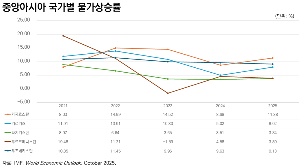 높은 물가상승률도 지속되었다. 중앙아시아 5개국의 평균 물가상승률은 2024년의 6.3%에서 2025년에는 7.4%로 상승했다. 공공서비스 요금 인상, 식품 가격 상승 등의 요인에 따라 카자흐스탄이 9.9%, 우즈베키스탄이 8.8%의 높은 물가상승률을 기록했으며, 투르크메니스탄에서도 국영기업에 대한 대출 증가, 공공부문 임금인상, 식품 가격 상승 등의 요인으로 물가상승률이 2024년의 4.8%에서 2025년에는 7.0%로 크게 상승했다(IMF, 2025).