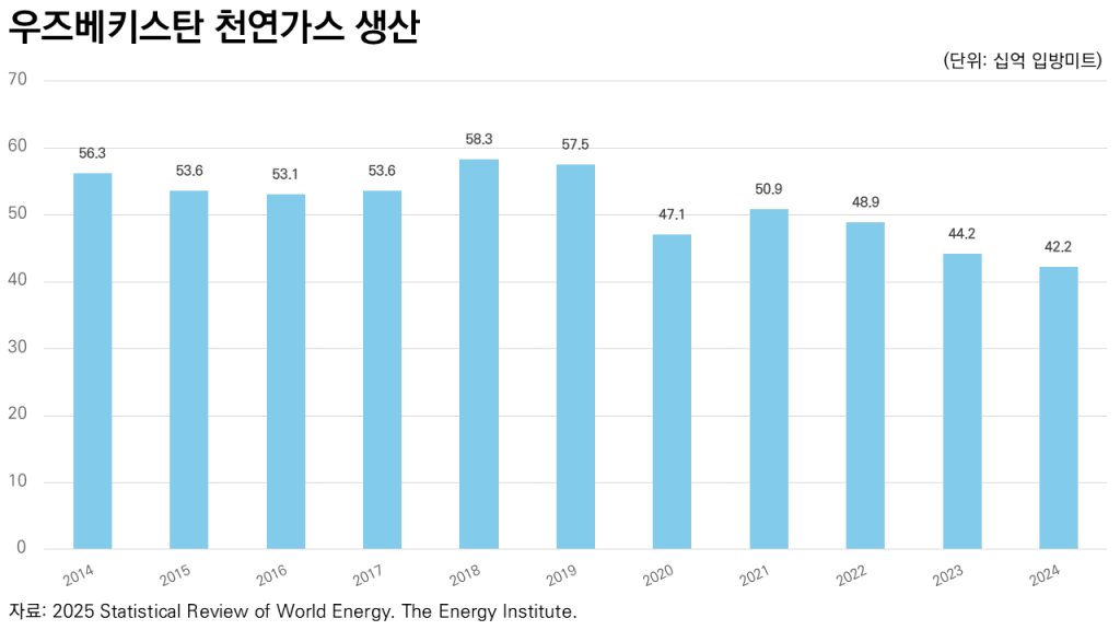 중앙아시아 경제의 취약성은 핵심 산업이라고 할 수 있는 에너지 부문에서도 나타난다. 에너지 자원에 대한 의존도가 높은 중앙아시아 경제의 문제점들이 최근 부각되고 있다. 중앙아시아 에너지 보유국들의 에너지 자원 생산량이 점차 하락하고 있는 것이다. 특히 우즈베키스탄은 가스 생산량 감소와 국내 소비 필요에 따라 2022년 말 가스 수출을 중단했고 2025년에는 완전한 가스 수출 중단을 선언한 바 있다.