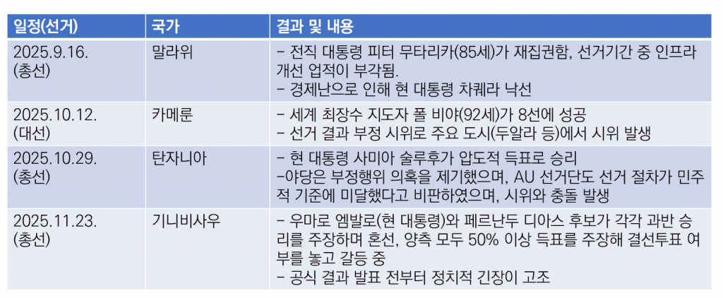 2025년 아프리카 주요 선거에서는 고령 지도자들의 재집권과 선거 불신이 두드러졌다. 말라위에서는 경제난으로 현직 대통령이 패배하고 전직 대통령 무타리카가 복귀했으며, 카메룬에서는 92세 비야 대통령이 8선에 성공해 부정선거 시위가 발생했다. 탄자니아는 사미아 대통령이 압승했지만 야당과 AU가 절차적 문제를 제기했고 시위가 이어지고 있다. 기니비사우는 양 후보가 모두 과반 승리를 주장하며 결선 여부를 둘러싼 혼란 속에 정치적 긴장이 고조되고 있다.