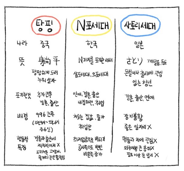 이러한 피투적 조건은 우선 한중일의 청년세대 담론에 반영되어 왔다. 한국 청년들은 1997년 외환위기 이후 신자유주의화 된 노동시장에 내던져졌다. ‘88만원 세대’에서 시작된 청년 담론은 ‘N포세대’를 거쳐 ‘헬조선’이라는 절망적 자기규정을 거쳤다. ‘헬조선’은 ‘탈조선’이란 용어와 동시에 유행했는데, 신자유주의 시대 청년들의 구조적 절망을 표현하는 정치적 언어인 셈이다. 다만 헬조선은 탈조선이라는 바깥으로의 모빌리티를 통해 극복 가능한 점이 암시되지만, ‘수저계급론’과 ‘계급통’은 양극화와 계층재생산의 장벽이 극복될 수 없음에 대한 자각인 듯하다. 일본 청년들은 1990년대 버블붕괴 이후 소위 ‘잃어버린 30년’ 속에서 ‘로스트 제너레이션’으로 명명되었고, 이는 ‘사토리 세대(悟り世代, 깨달음의 세대)’라는 체념의 문화로 이어졌다. 중국 청년들은 2008년 금융위기 이후 고도성장이 둔화되면서 ‘개미족(蟻族)’에서 ‘탕핑’ 세대로 변모했다. 이제 중국 화이트칼라 청년들은 자신들이 블루칼라인 농민공과 다를 바 없는 ‘따공런(打工人)’이라고 자조하기도 한다(김란·박치현, 2023).